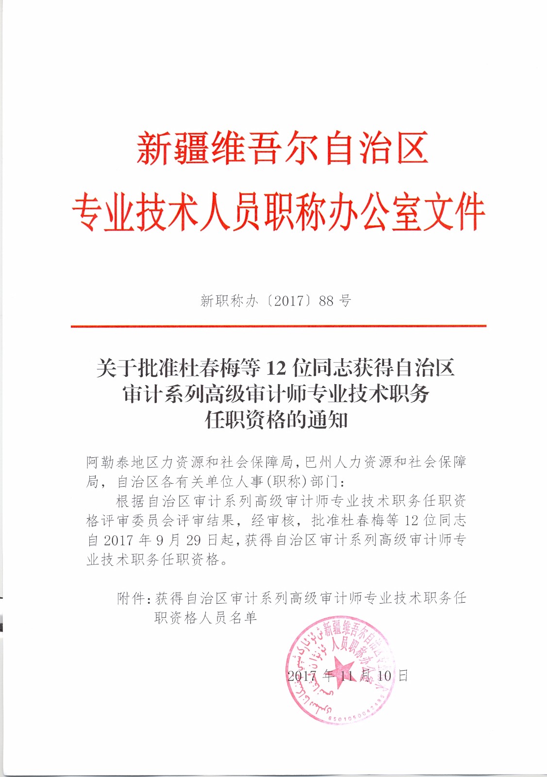 关于批准杜春梅等12位同志获得自治区审计系列高级审计师专业技术职务任职资格的通知